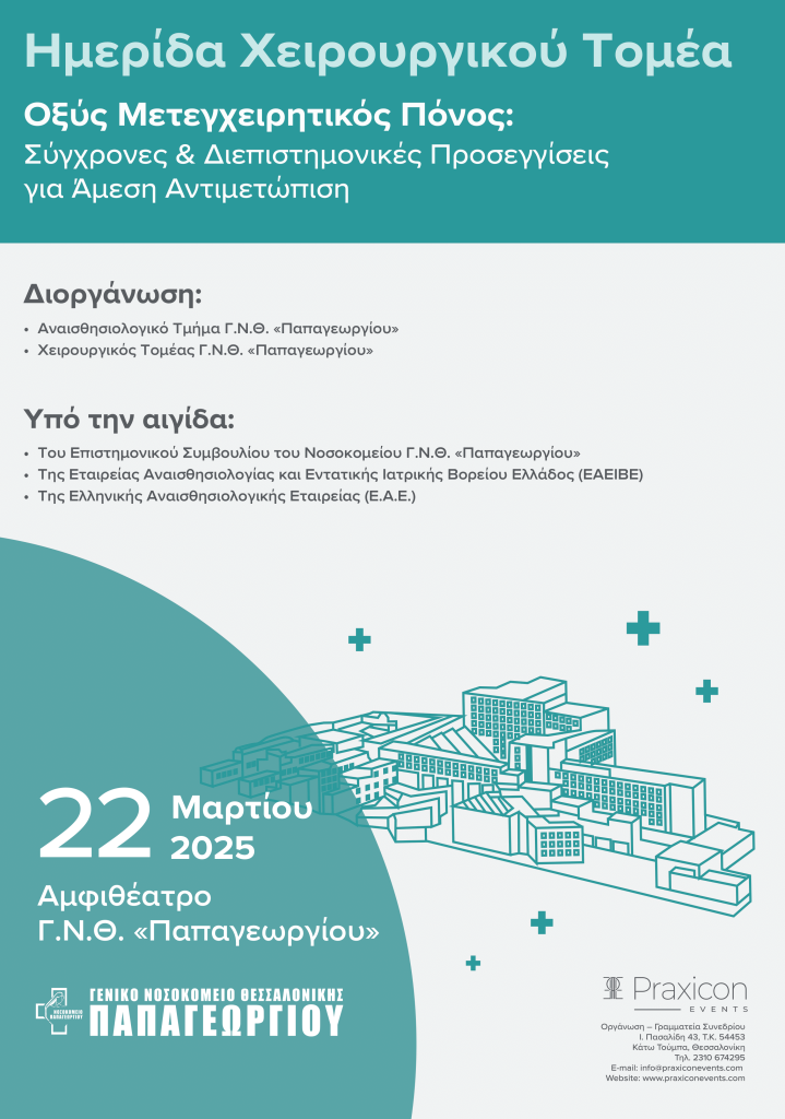 Σας καλωσορίζουμε στην Hμερίδα που διοργανώνεται από το Αναισθησιολογικό Τμήμα σε συνεργασία με τον Χειρουργικό Τομέα του Γενικού Νοσοκομείου Θεσσαλονίκης “ΠΑΠΑΓΕΩΡΓΙΟΥ” με θέμα “Οξύς Μετεγχειρητικός Πόνος: Σύγχρονες & Διεπιστημονικές Προσεγγίσεις για Άμεση Αντιμετώπιση».