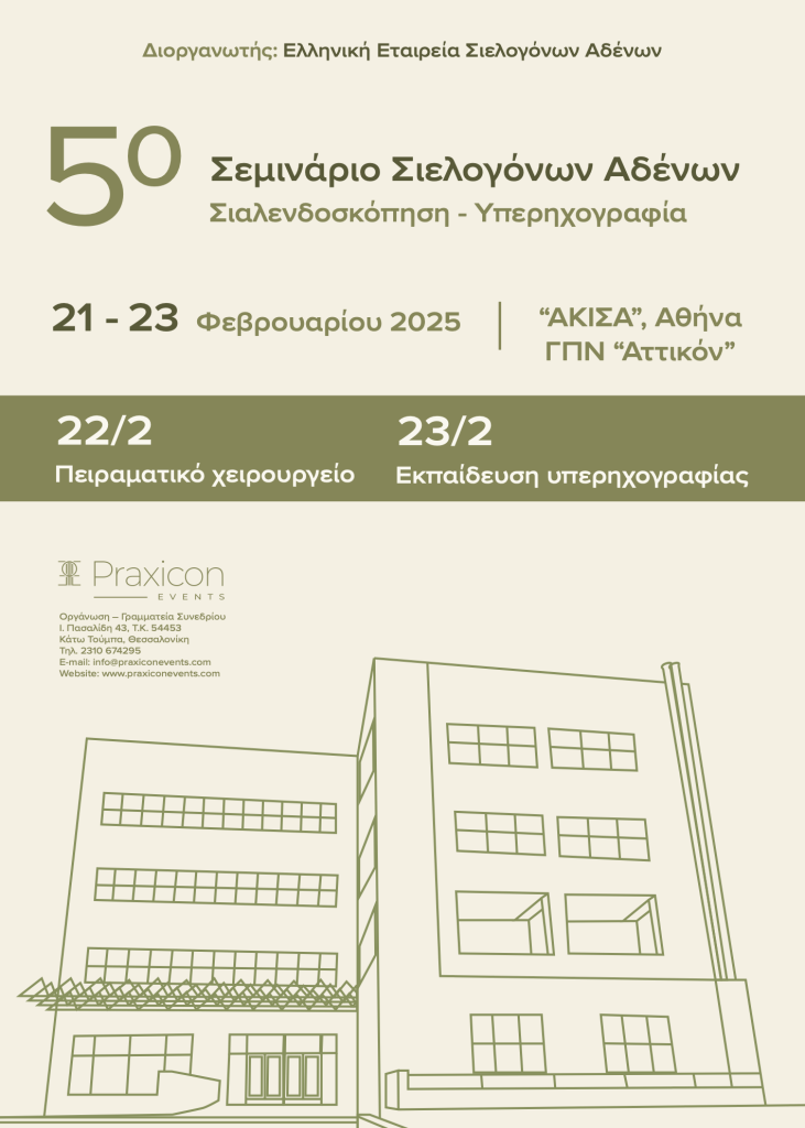 Η Ελληνική Εταιρεία Σιελογόνων Αδένων για ακόμα μια φορά διοργανώνει ένα μετεκπαιδευτικό σεμινάριο με ειδική θεματολογία τα αποφρακτικά νοσήματα των σιελογόνων αδένων, στην Αθήνα στα τέλη του επόμενου Φλεβάρη. Το σεμινάριο θα έχει ειδική στόχευση τόσο στις ομιλίες ώστε να δίδονται πρακτικές συμβουλές στην αναγνώριση και διαχείριση αυτών των περιστατικών αλλά πολύ περισσότερο θα δοθεί έμφαση στην πρακτική εκπαίδευση. Ειδικότερα το επιστημονικό πρόγραμμα απευθύνεται κυρίως σε Ωτορινολαρυγγολόγους, Γναθοπροσωπικούς χειρουργούς, Οδοντιάτρους, θα περιλαμβάνει ομιλίες για όλες τις χειρουργικές πρακτικές με εκπαιδευτικά βίντεο και πρακτική άσκηση στη σιαλενδοσκόπηση σε κεφαλές χοίρων, καθώς και πρακτική άσκηση στην υπερηχογραφία των σιελογόνων αδένων σε πραγματικό χρόνο μεταξύ των συμμετεχόντων.
